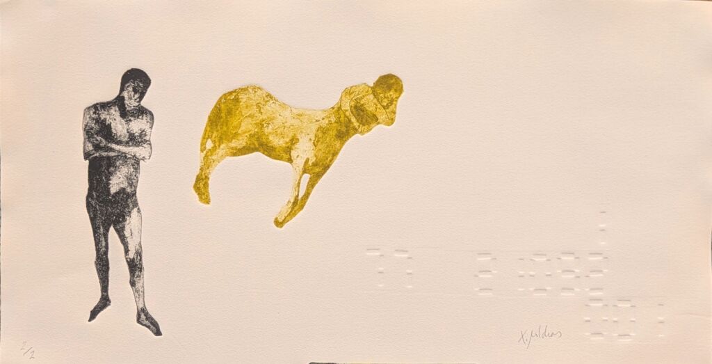 Unha figura mitolóxica e outra humana establecen unha relación decodificada en números nunha paisaxe neutra.